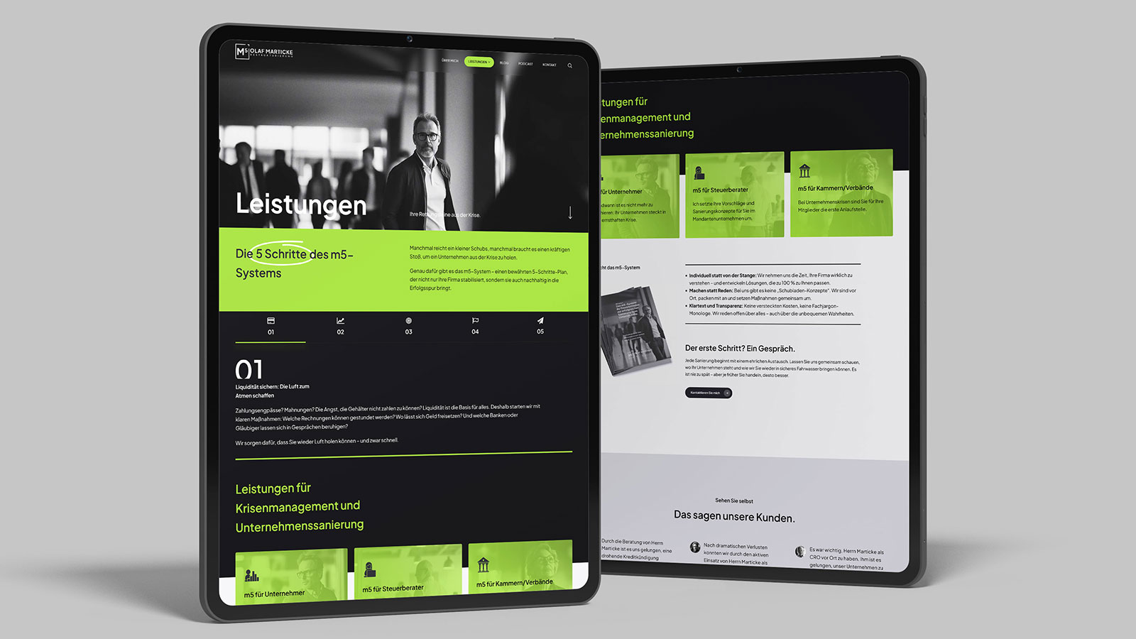 As an experienced corporate reorganizer, Olaf Marticke stands for speed, clarity and substance. The same goal applied to his digital presence: a measurable, resilient foundation that also digitally reflects his positioning as a decision-making partner for SMEs.